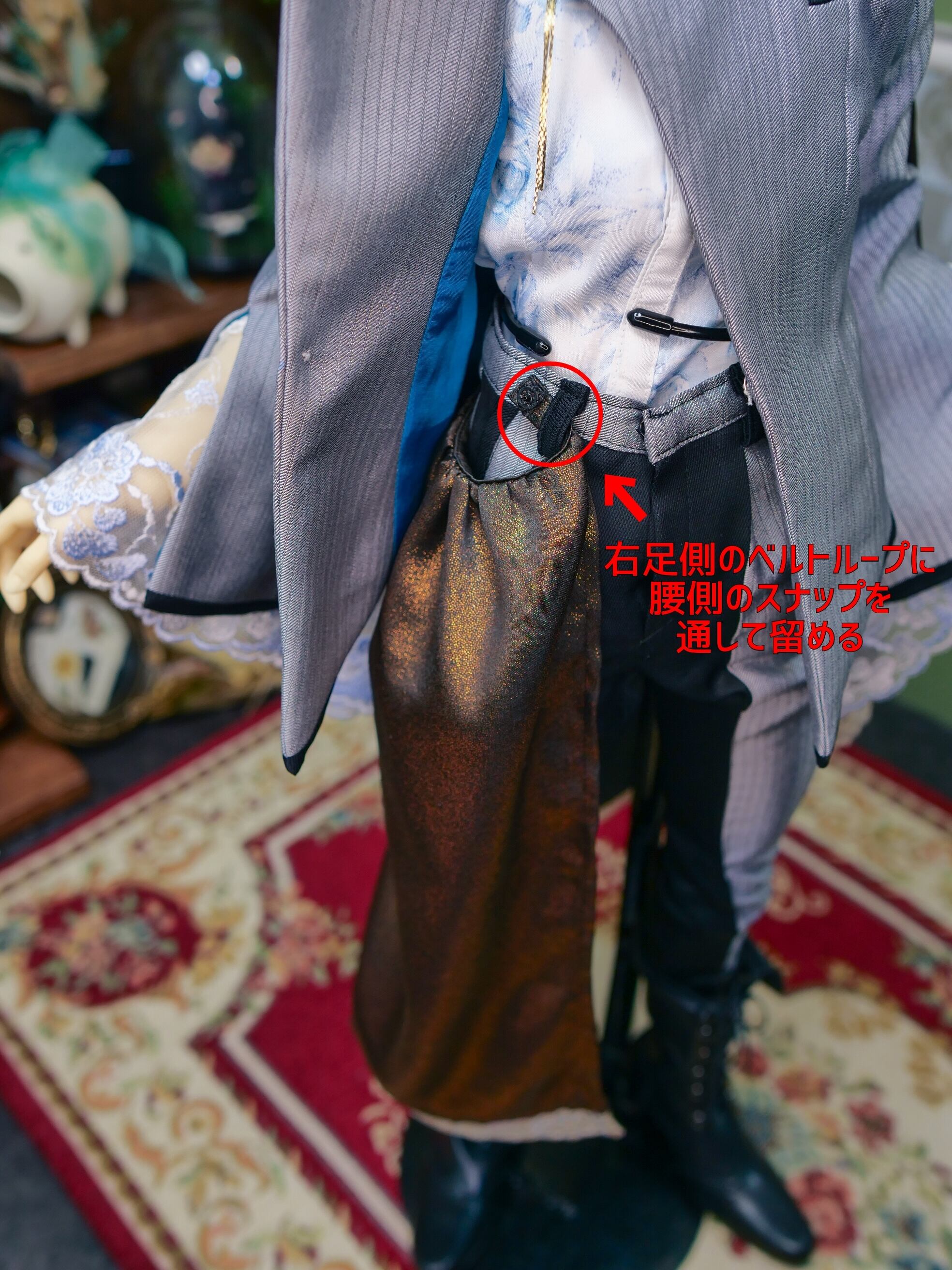 ジャケット左肩のスナップを開閉しマントのループを通し反対側はボトムのベルト通しに止めてください。