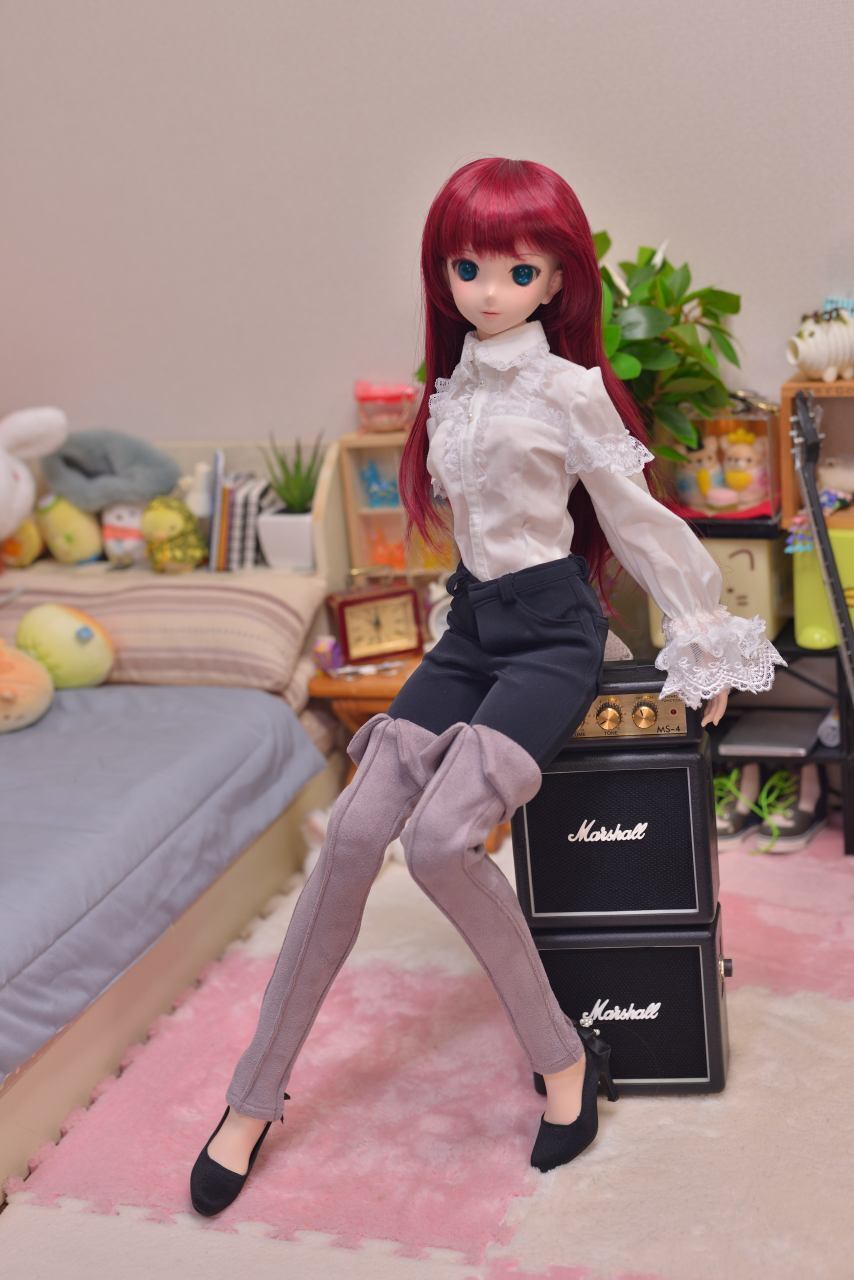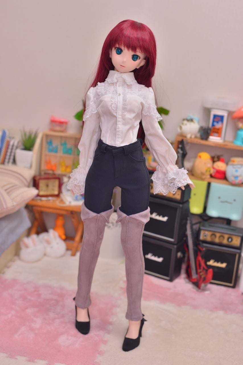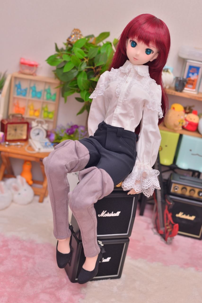 ブーツのような質感と折り返しが特徴の細身なパンツになりました。