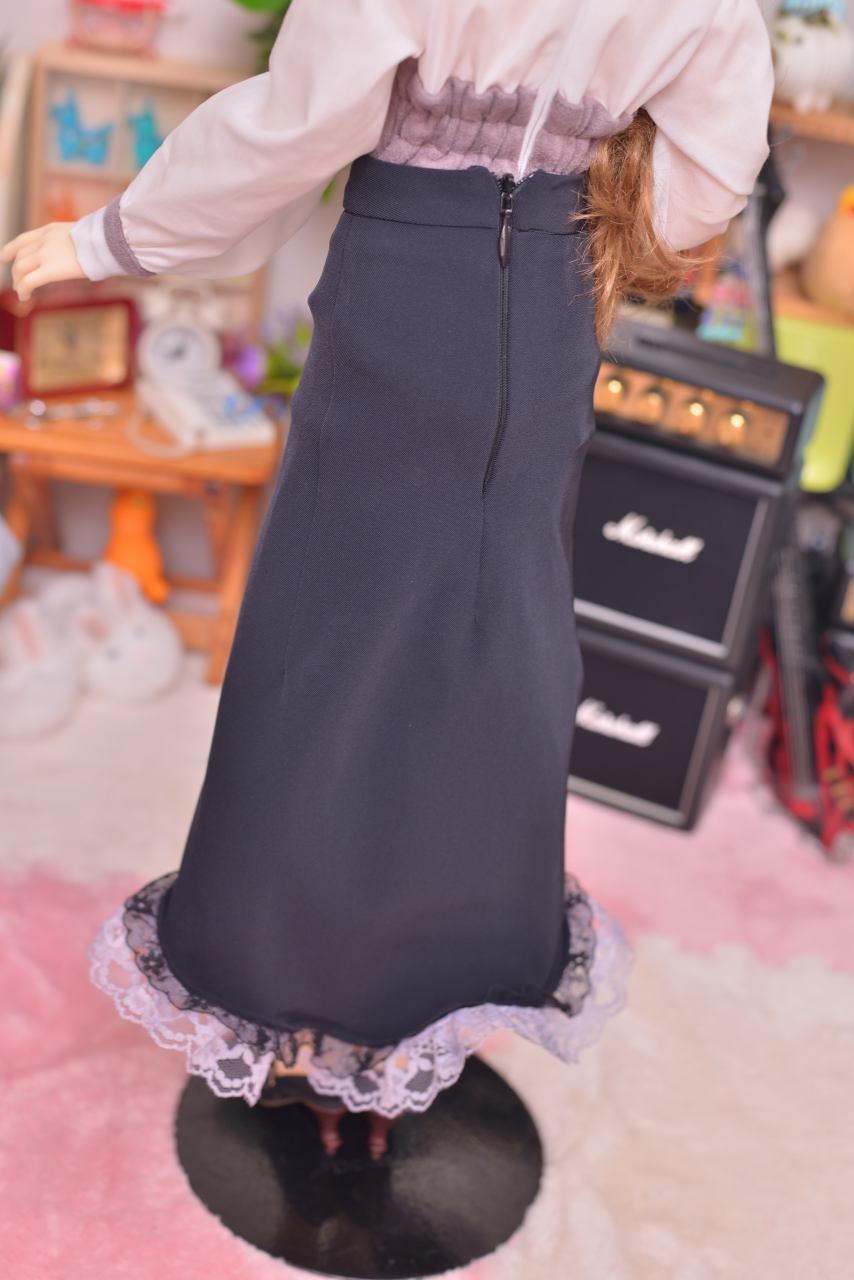 タイトスカートの良さであるウエスト周りのシルエットとラップスカートのシンプルさを裾のレースとヘム形状で綺麗にまとめてみました。