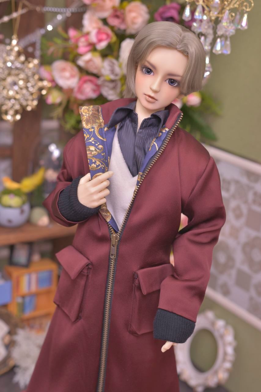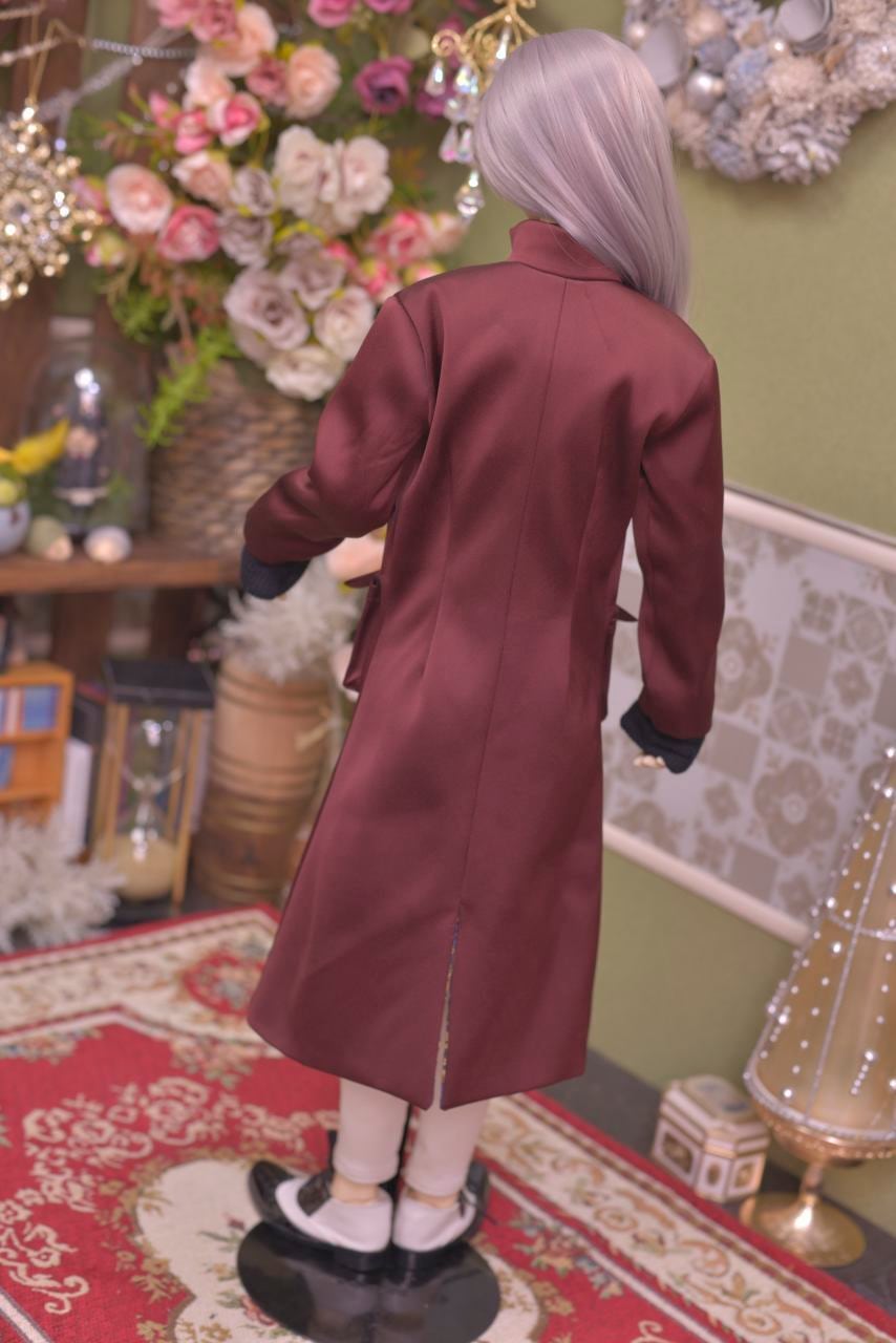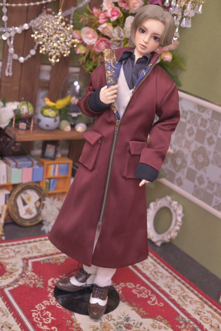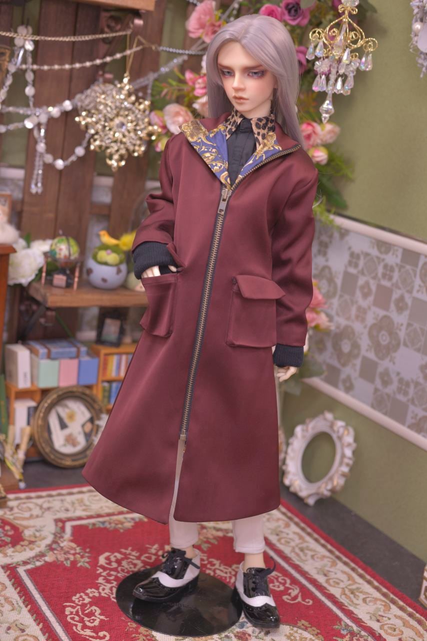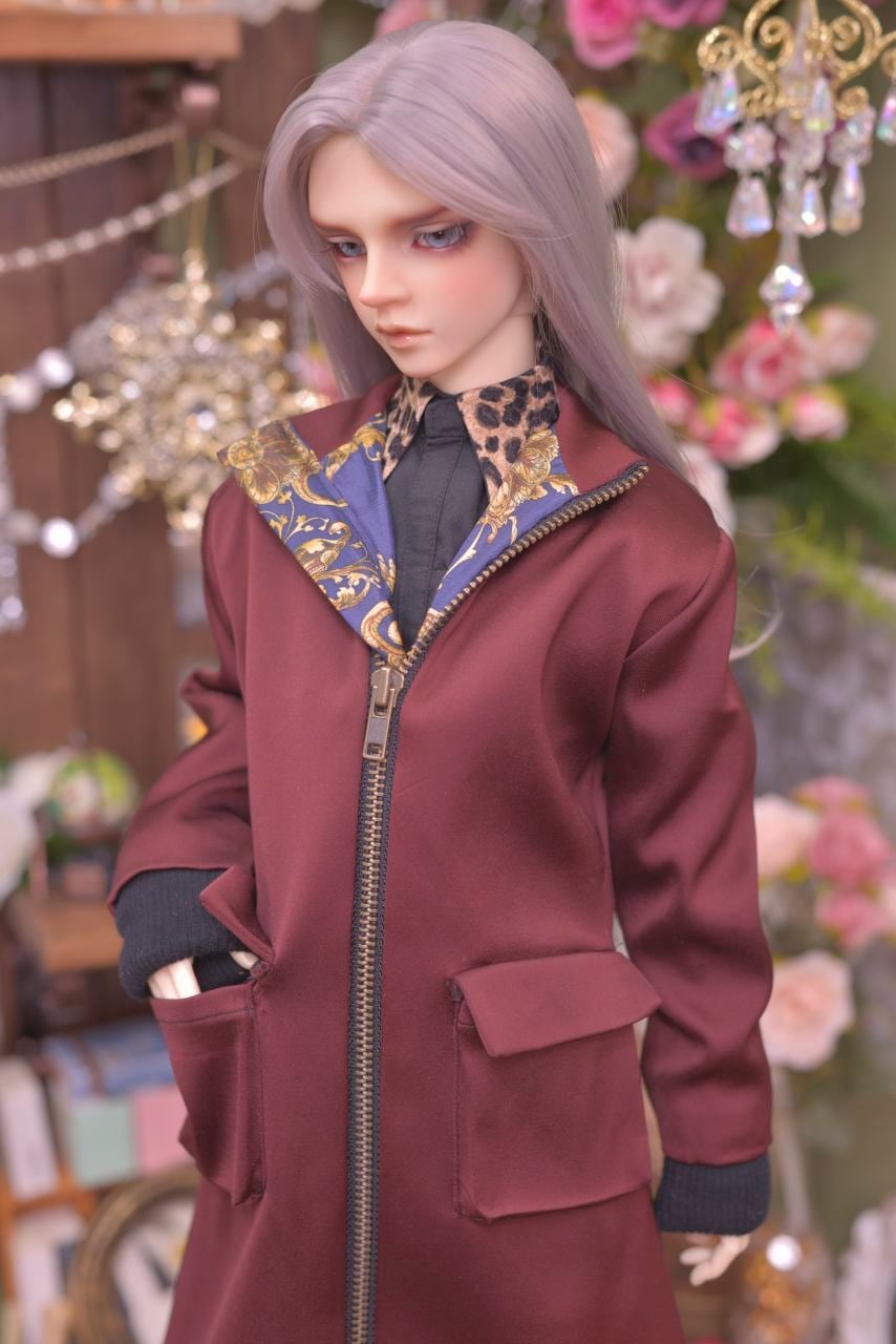 重厚感のあるボルドーカラーとネイビーのアラベスク模様の裏地とのリズム感がお洒落なジャンパーコート